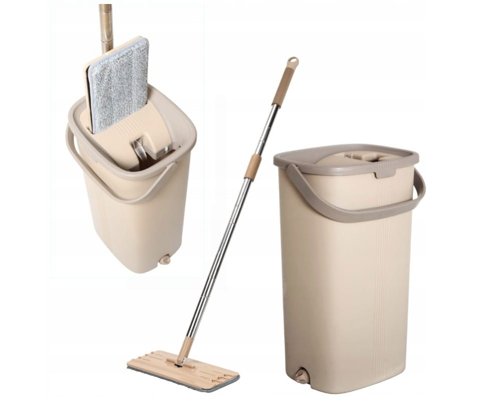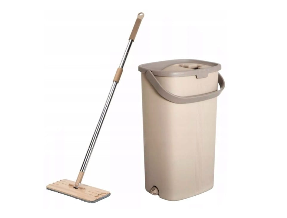 Kompaktowy mop płaski z dwukomorowym wiaderkiem wyposażonym w nowoczesny system wyciskający.